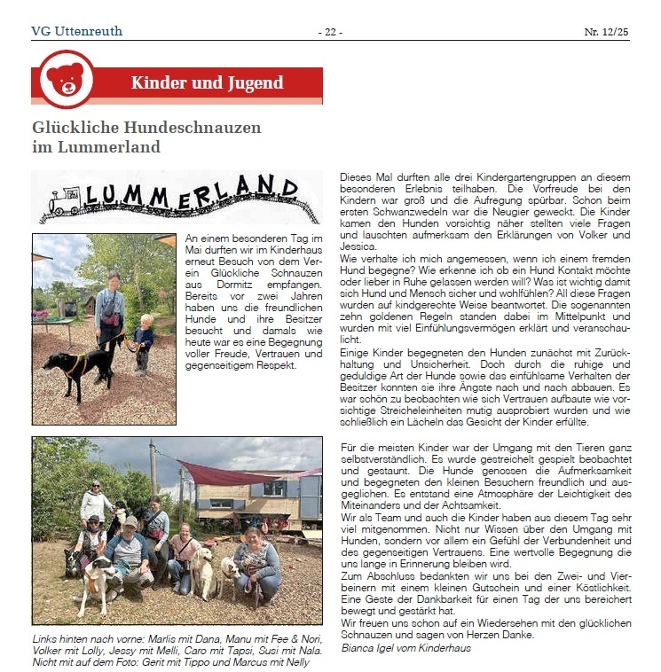 Ganz spezielle Gäste haben im Oktober den Kindern des Kindergartens in Dormitz einen Besuch abgestattet: Wir, der Hundeverein „Glückliche Schnauzen“ aus Dormitz.